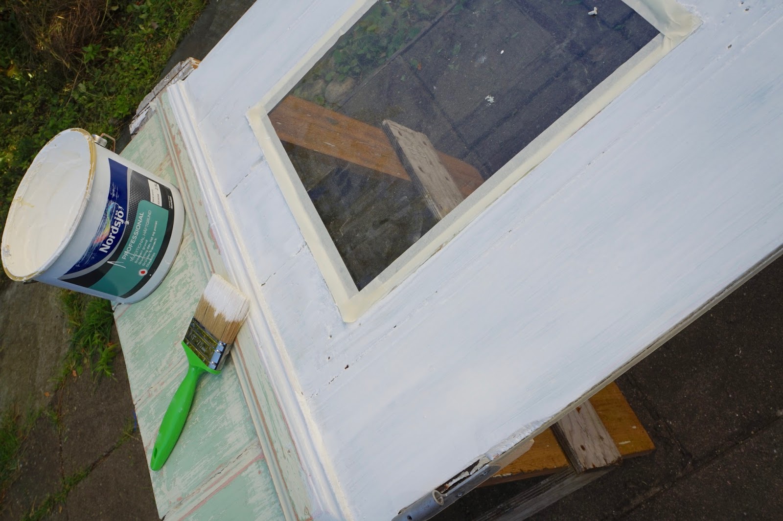 Døren ønsket jeg å bevare og den skal nå brukes inn til boden vi har laget i gangen. Jeg har pusset den ned litt. Det er gammel linolje maling som er på den. Når jeg pusset kom det fram 3 typer farger på gammel linolje. En oker gul , en rødbrun og en mint grønn. Fargene stammer tilbake til ca Klassisismen som var på 1780-1850 tallet.
